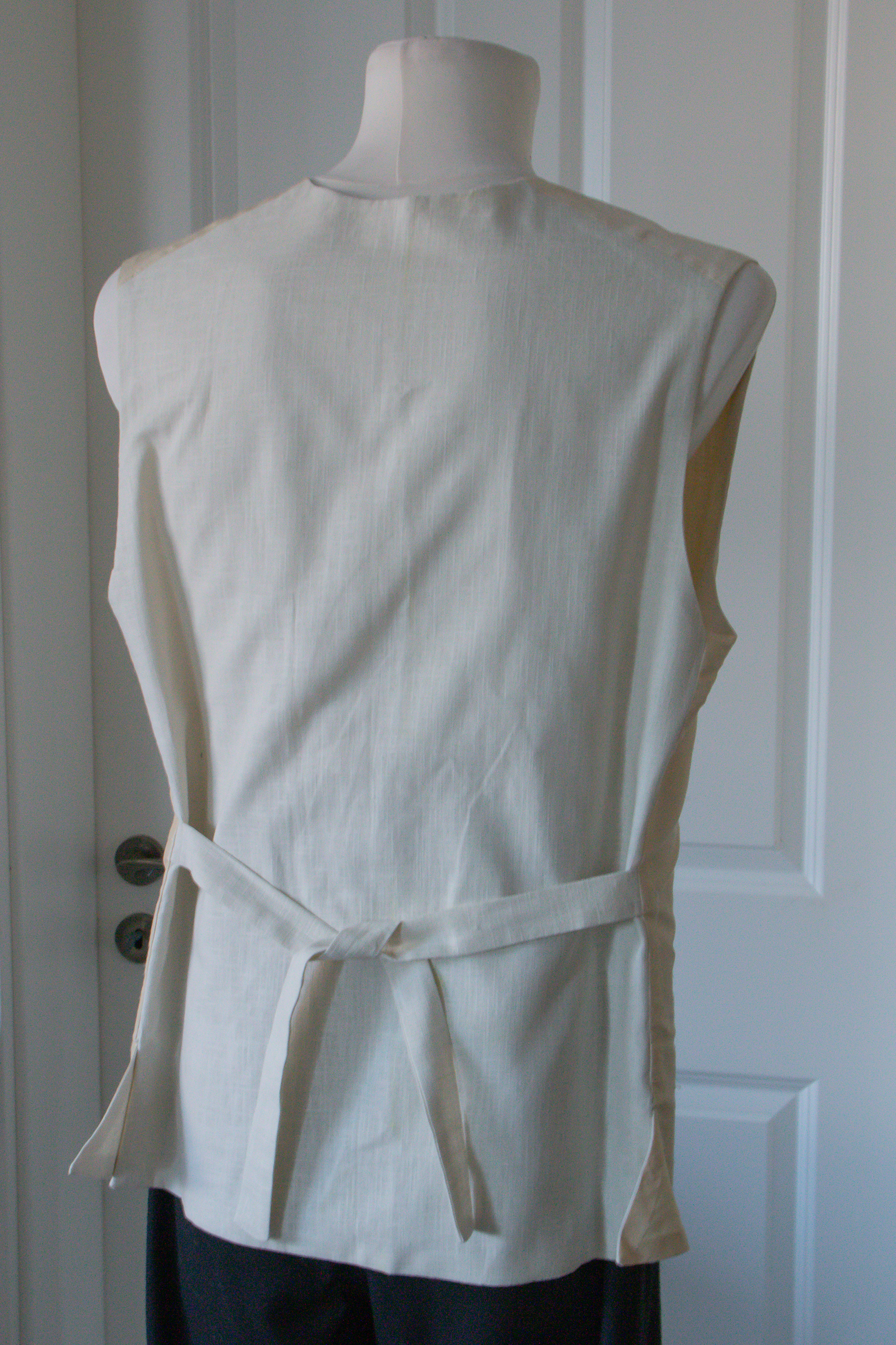 Die Weste ist entsprechen des späten Rokoko auch eher schmal geschnitten und endet etwa auf Höhe Hüfte. Sie hat im Rücken Bänder, mit denen die Taillenweite angepasst werden kann.
