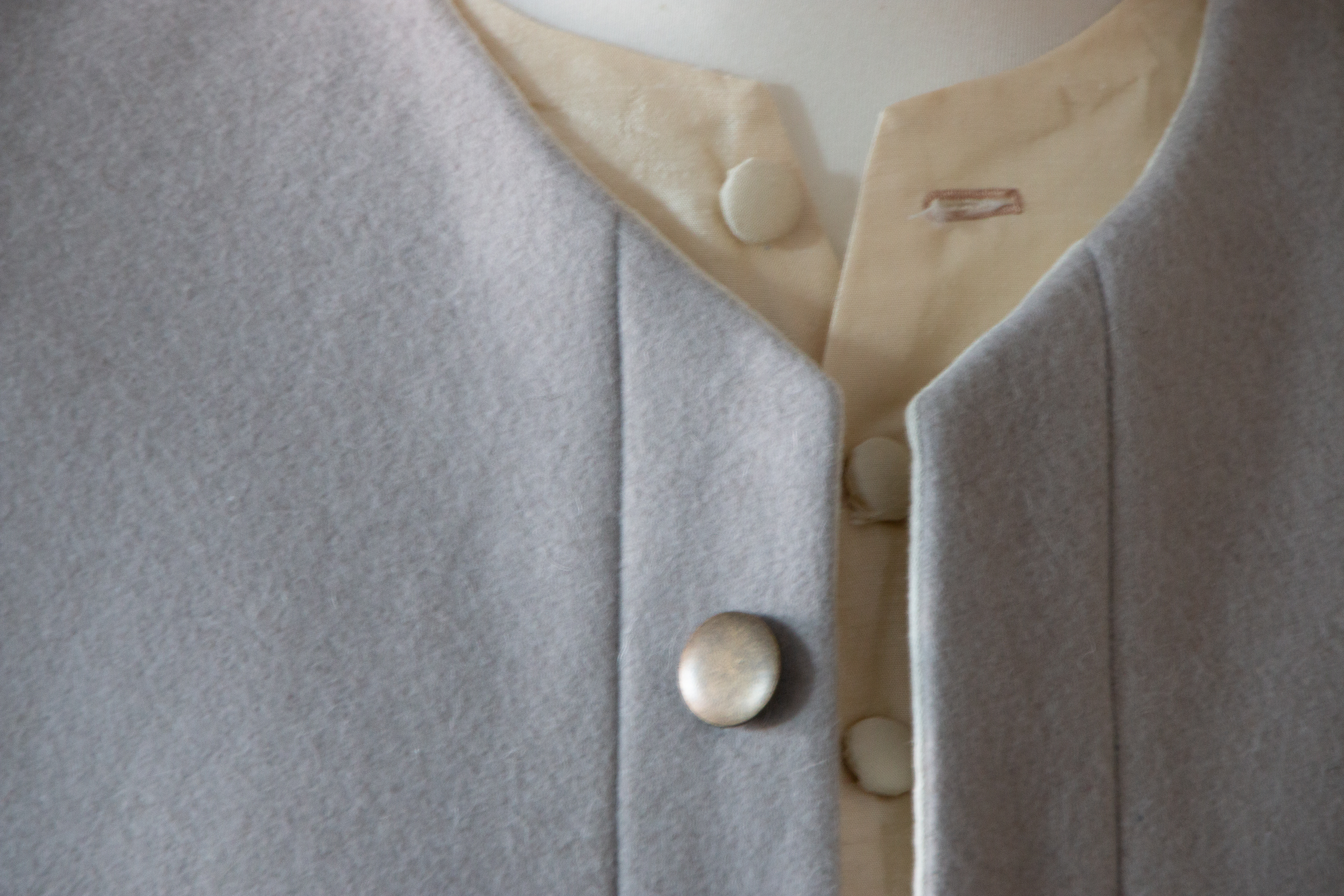 Die Vorderseite der Weste ist aus cremefarbener, fast vollständig glatter Dupionseide (100% Seide). Die Knöpfe sind ebenfalls mit der Seide überzogen.