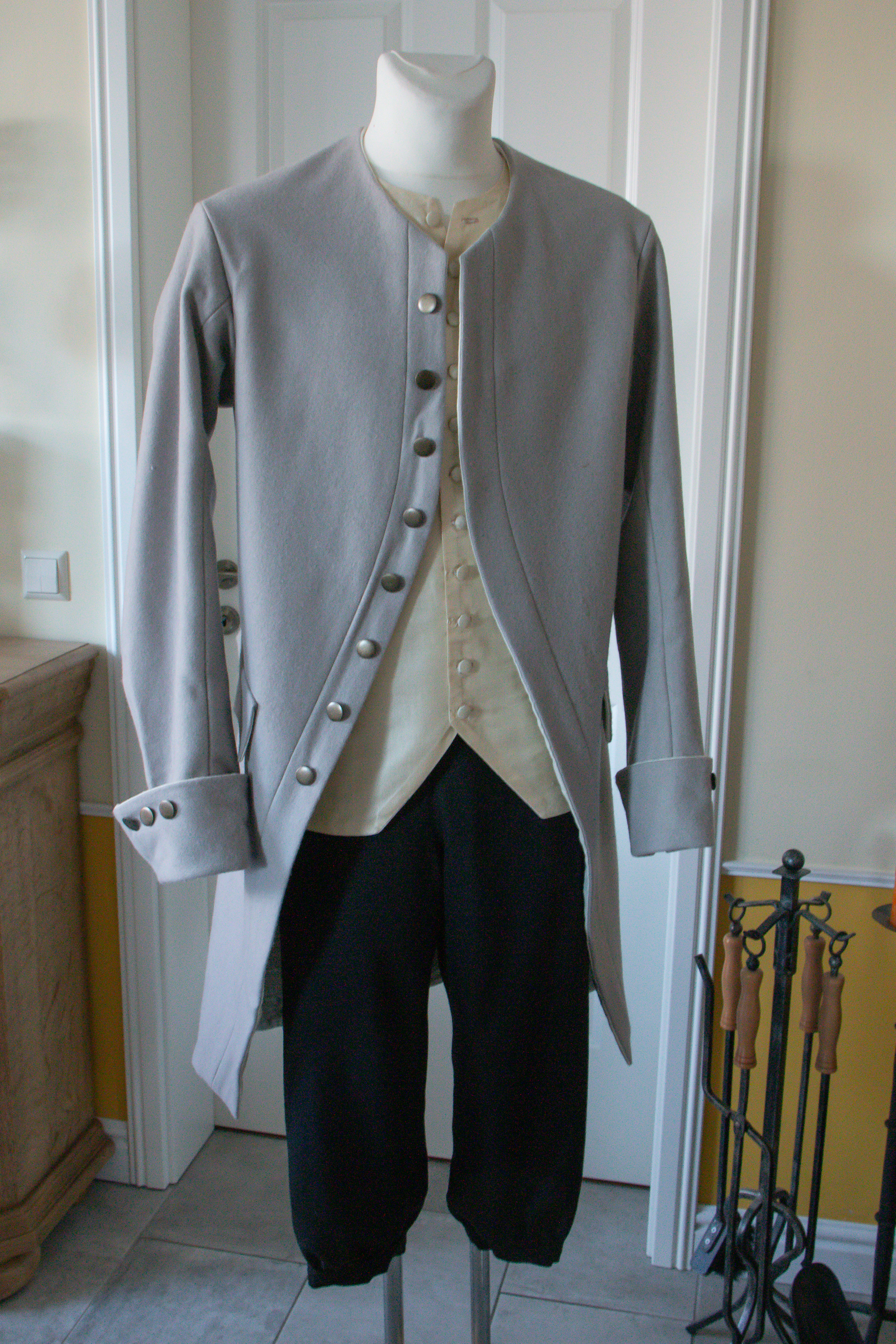 Dieser Anzug passt für das späte Rokoko in der zweiten Hälfte des 18. Jahrhundert, also der Zeit von Marie Antoinette und Friedrich dem Großen. Er besteht aus einem schmal geschnittenen Gehrock aus hellgrauer Wolle, einer Weste aus cremefarbener Seide und schwarzen Kniebundbosen. Das ganze Outfit ist perfekt für einen Besuch in Venedig zum Karneval (wenn du dazu gehören willst aber nicht auffallen) oder Veranstaltungen im Bereich 18. Jahrhundert. Es gibt auch einige LARPS, in die er vom Setting passen würde. Für Führungen in Museen in entsprechender Kleidung ist der Anzug gut geeignet, auch weil er ein wenig Flexibilität in der Größe zulässt.