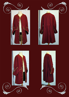 Ein Gehrock in schönen dunklem Rotton, abgesetzt mit altgoldener Brokatborte. Dazu gehören eine Weste aus braunem Leinen sowie ein Piratenhemd aus cremefarbener Baumwolle.