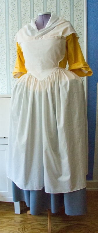 Wie gesagt, eine gelbe Jacke aus Baumwolljacquard mit kleinen Rosenmuster. Dazu ein grauer Rock aus Woll-Poly-Gemisch (neu gekauft, war leider nichts mehr im Fundus). Die Schürze ist nach der Vorlage aus Costume Close-up, das Fichu einfach ein Dreieck, das nach Zuschnitt der Schürze noch übrig war. Beides reine Baumwolle.