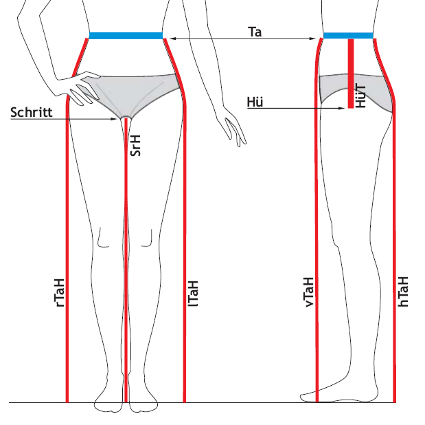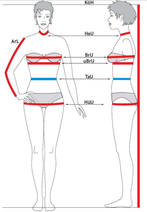 Nimm die Maße nach Möglichkeit in Unterwäsche oder über eng sitzender Kleidung. Für das Taillenmaß und das Hüftmaß bitte auf keinen Fall eine tief sitzende Hose tragen. Gib keine Zugaben dazu oder ziehe etwas von den Maßen ab. Das mache ich selbst.