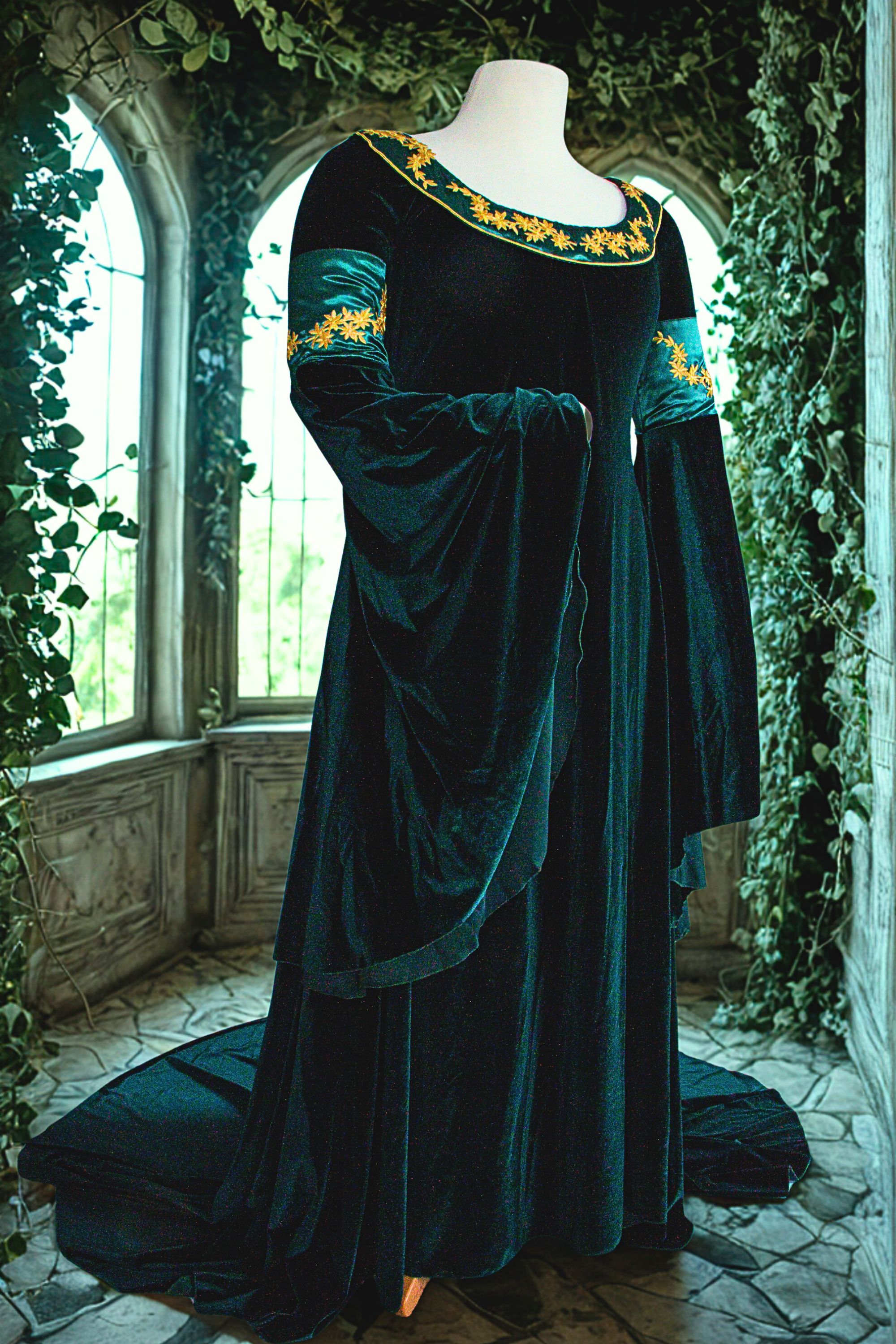 Das hier angebotene Kleid orientiert sich am Schnitt des Filmkleids, ist aber in einem anderen Farbschema, nämlich dunkelgrün und gold.