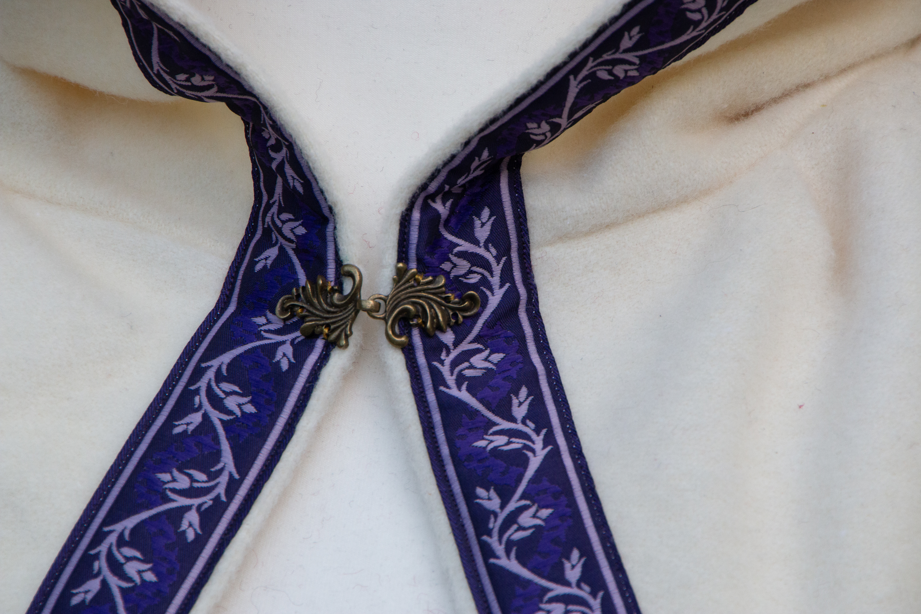 Der Umhang ist aus reiner Walkwolle (100% Wolle) in einem hellen cremetone. Er ist mit einer Borte in lila und rosa abgesetzt.