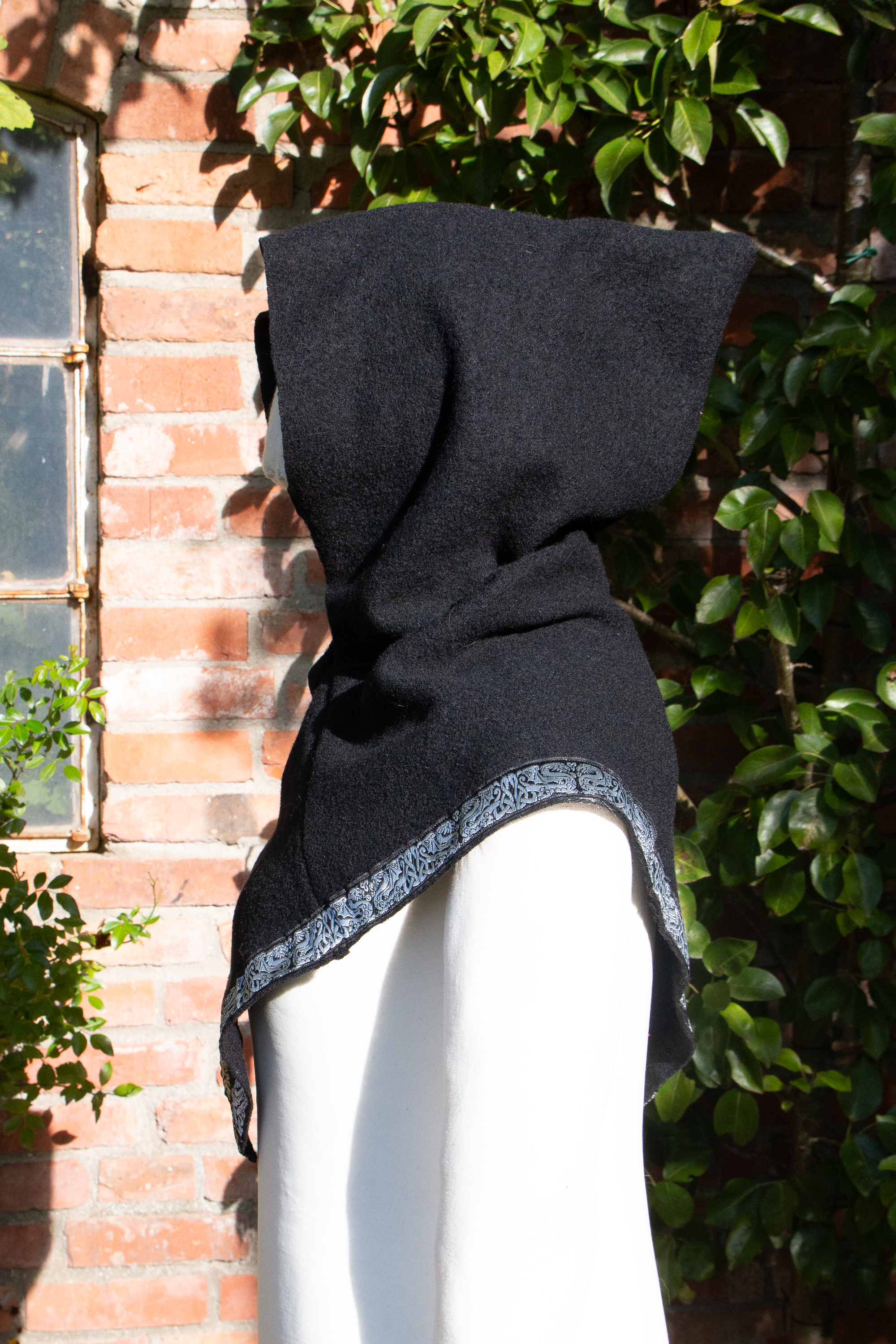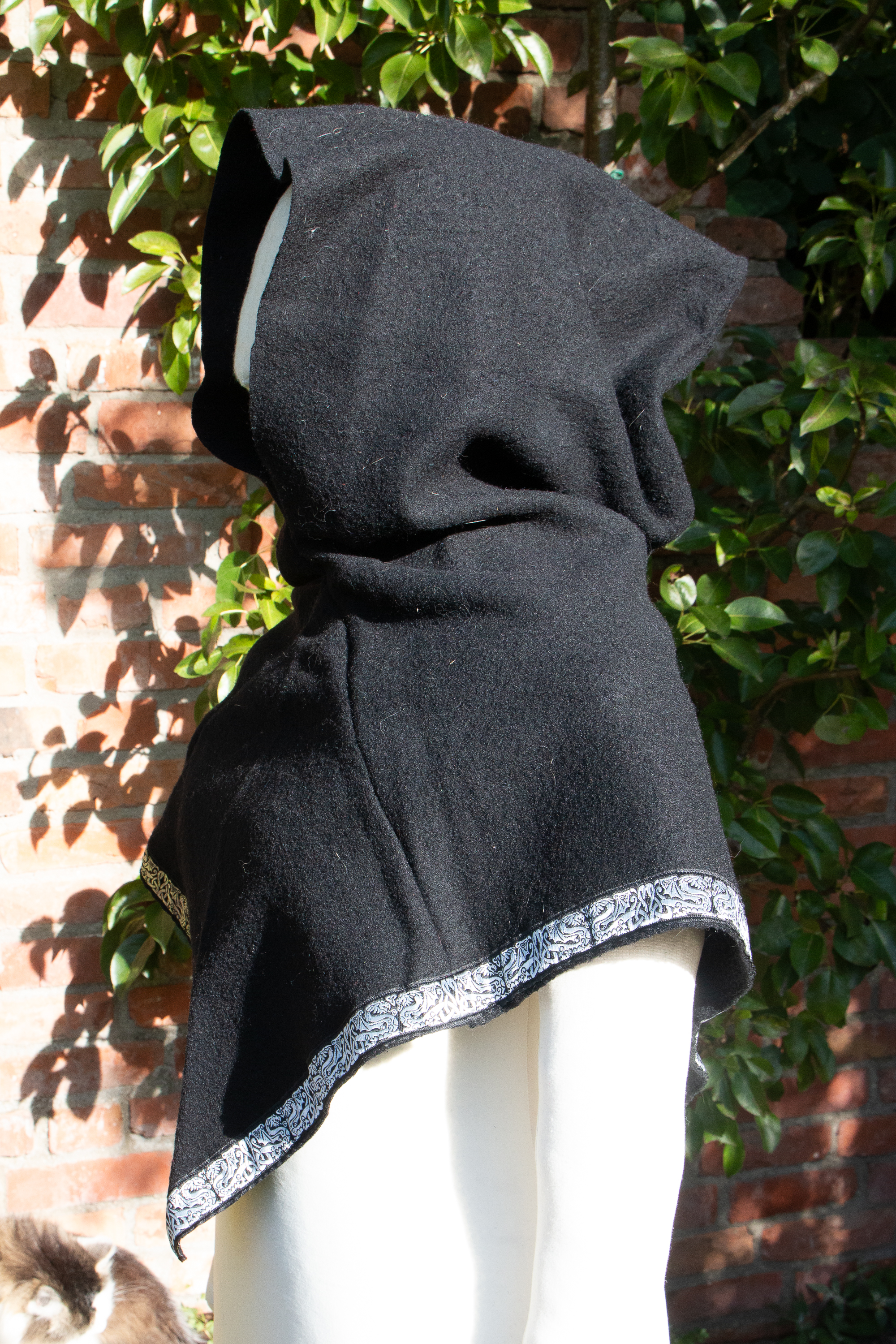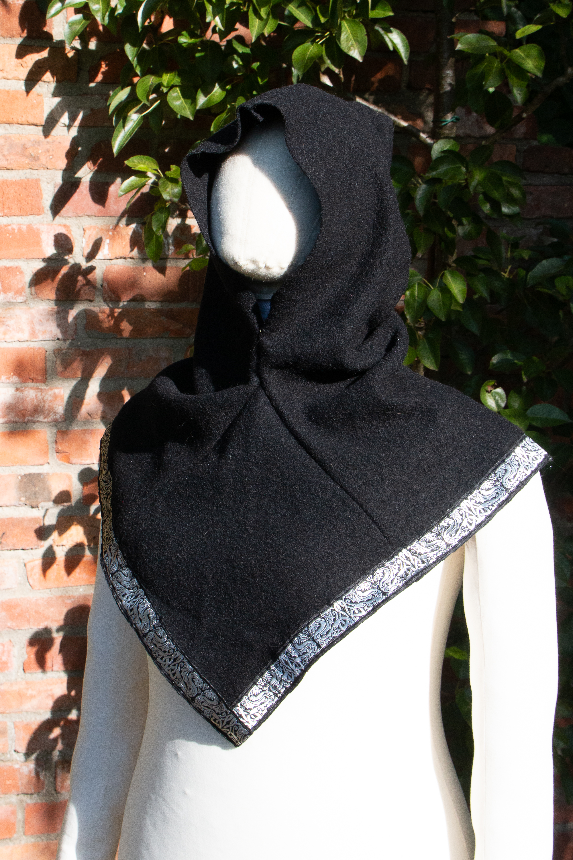 Die Gugel ist aus schwarzer Walkwolle (100% Wolle), abgesetzt mit einer keltischen Drachenborte in schwarz und silber