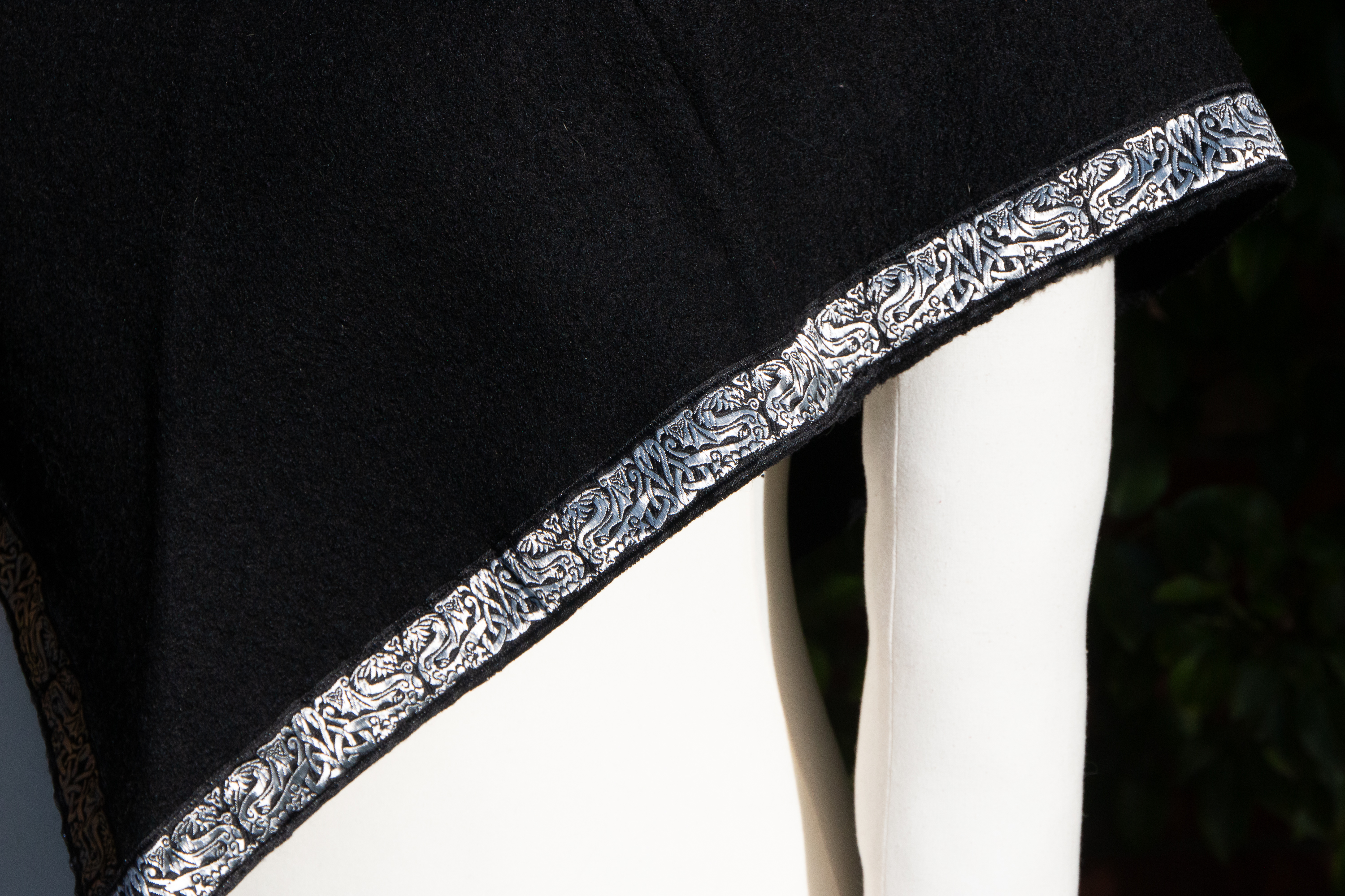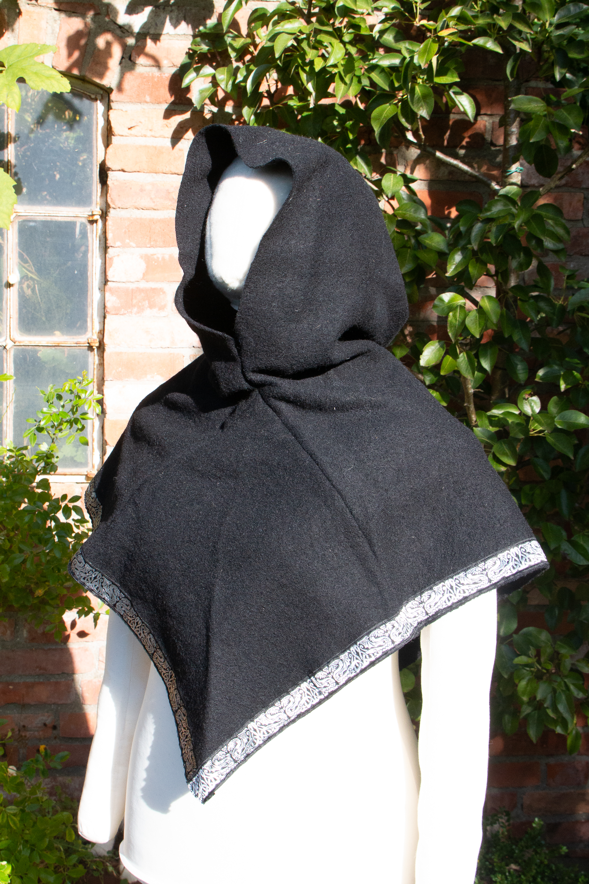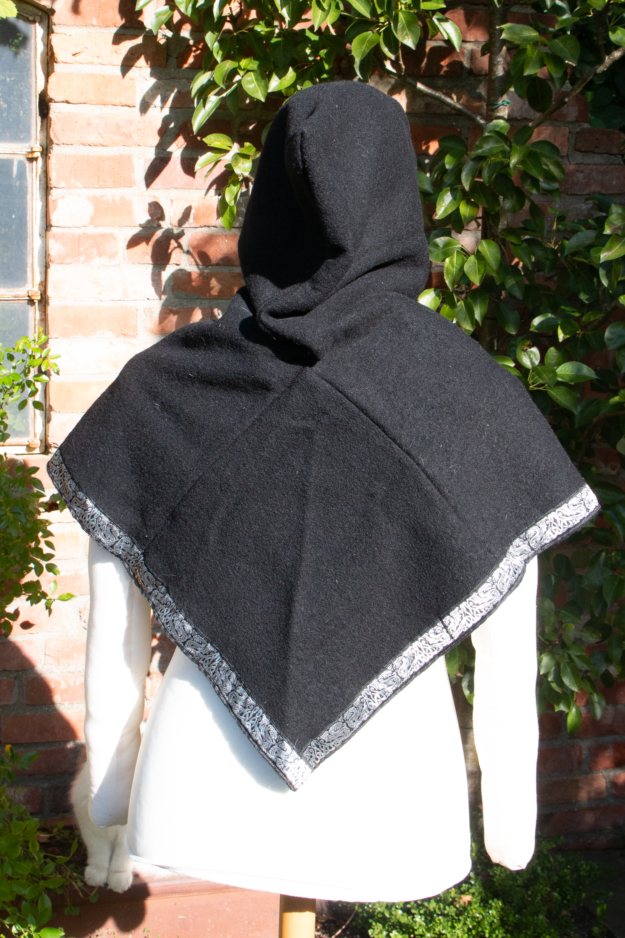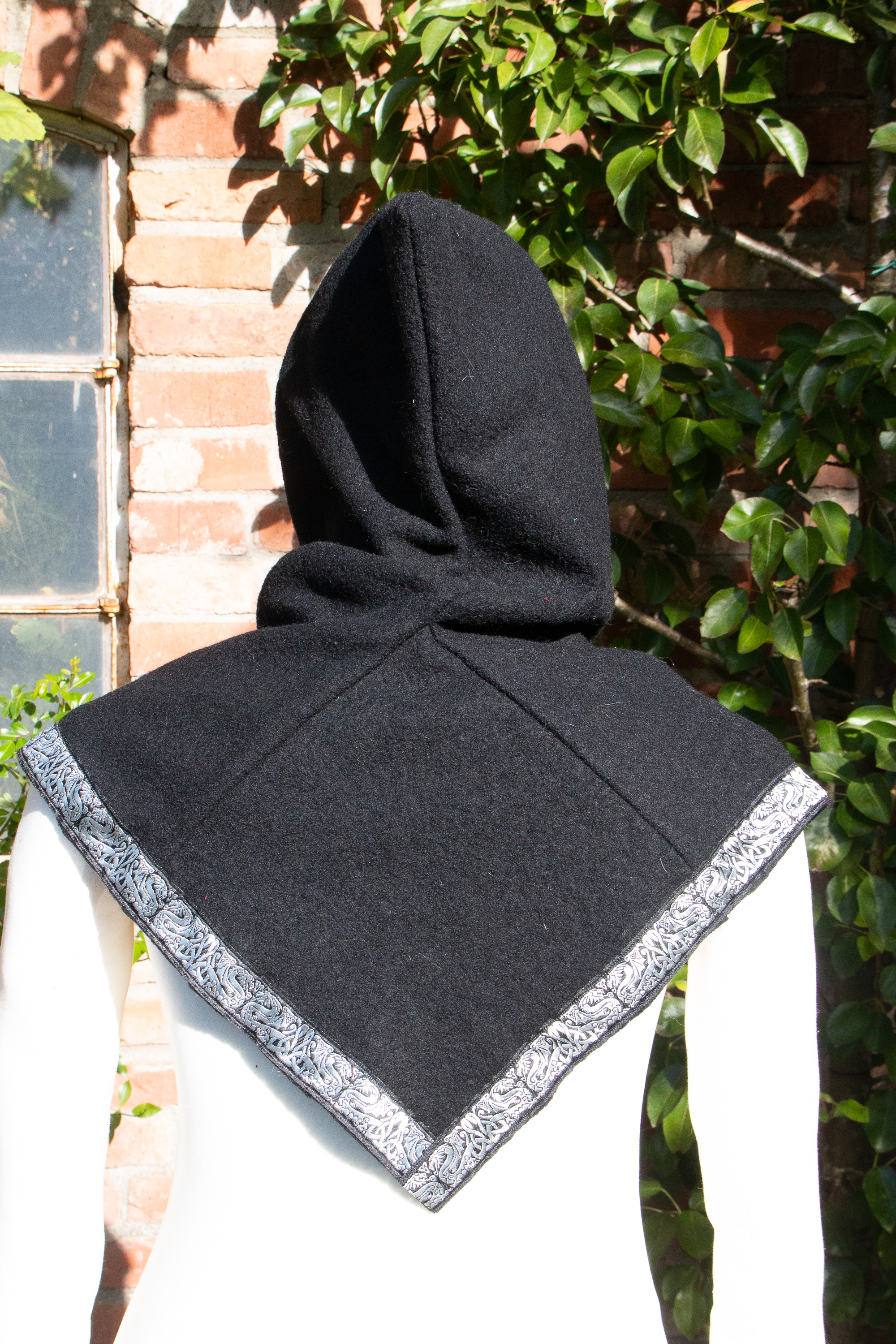 Die Gugel ist aus schwarzer Walkwolle (100% Wolle), abgesetzt mit einer keltischen Drachenborte in schwarz und silber